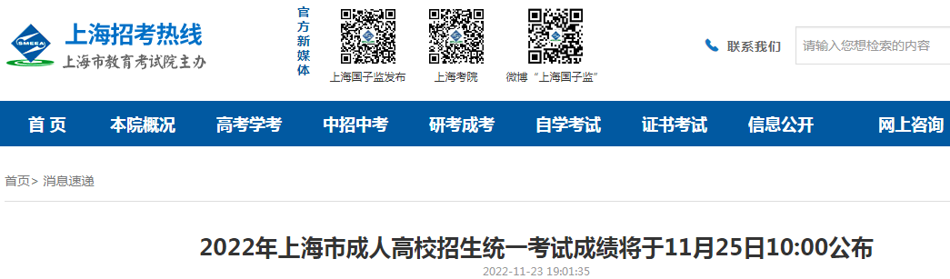 成人高考頻道從上海市教育考試院了解到,2022年上海市成人高考成績將于11月25日10:00公布,詳情如下: