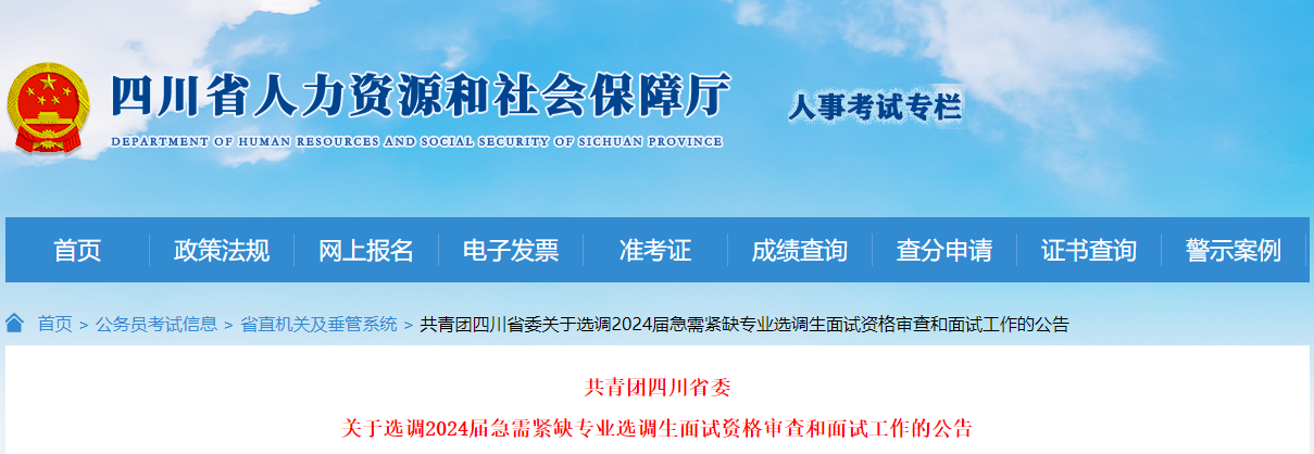 按照中共四川省委組織部關(guān)于2024屆急需緊缺專業(yè)選調(diào)生招錄公告(以下簡稱“公告”)的有關(guān)規(guī)定,根據(jù)考生筆試科目成績,現(xiàn)將共青團(tuán)四川省委選調(diào)2024屆急需緊缺專業(yè)選調(diào)生的面試資格審查和面試工作有關(guān)事項(xiàng)公告如下。