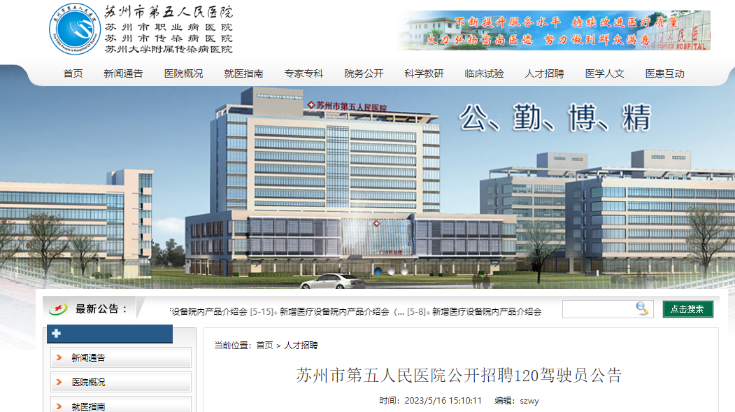 2023江蘇蘇州市第五人民醫(yī)院招聘120駕駛員1人,報名時間:2023年5月17日至2023年5月26日(工作日8:00-11:30,13:00-16:30),現(xiàn)將招聘公告原文發(fā)布如下: