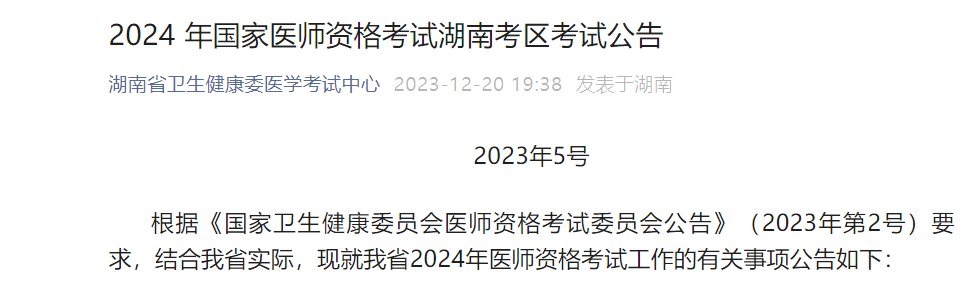 從湖南省衛(wèi)生健康委醫(yī)學(xué)考試中心發(fā)布的《2024年國(guó)家醫(yī)師資格考試湖南考區(qū)考試公告》得知,2024年湖南中醫(yī)執(zhí)業(yè)醫(yī)師考試報(bào)名時(shí)間、條件、流程及入口已公布,1月22日至2月4日24時(shí)網(wǎng)上報(bào)名,具體詳情如下: