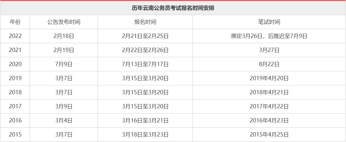 根據(jù)歷年云南省公務(wù)員考試報(bào)名時(shí)間來看:從2015年-2019年,云南公務(wù)員公告在3月份初左右發(fā)布,報(bào)名時(shí)間通常在3月中下旬左右,2020年由于疫情因素影響,考試推遲至下半年開展,從近兩年云南省考公告發(fā)布時(shí)間來看較以往提前發(fā)布近一個(gè)月左右的時(shí)間,2023年云南公務(wù)員考試公告極有可能會(huì)按照近兩年省考公告考試時(shí)間安排,具體發(fā)布時(shí)間還以官方發(fā)布信息為準(zhǔn)。