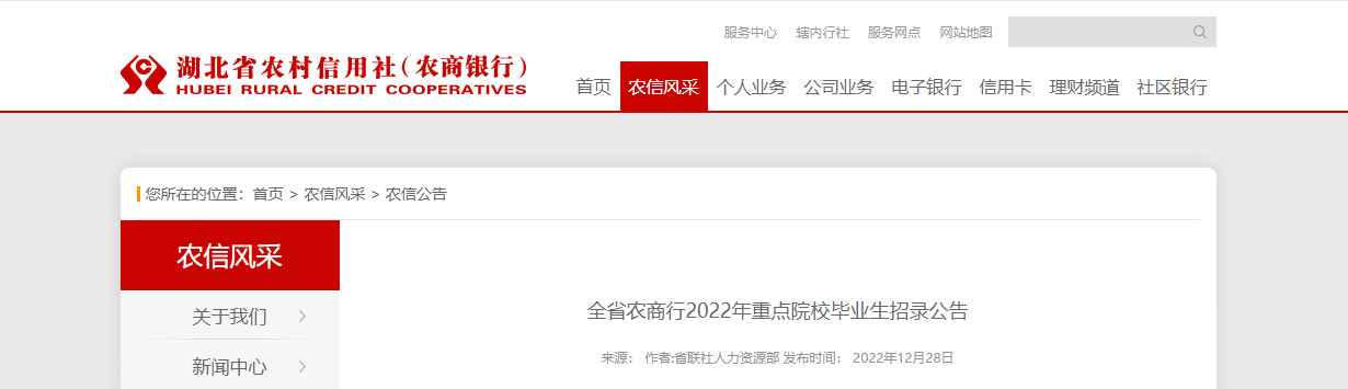 2022年湖北全省農(nóng)商行重點(diǎn)院校畢業(yè)生招錄168人,報(bào)名時(shí)間:2022年12月28日至2023年1月3日,現(xiàn)將招聘公告發(fā)布如下: