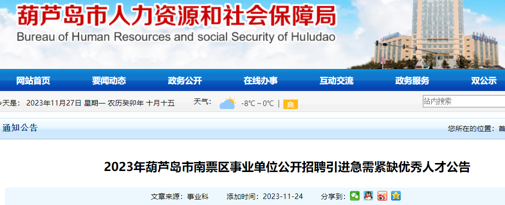 小編根據(jù)葫蘆島市人力資源和社會保障局發(fā)布“2023年葫蘆島市南票區(qū)事業(yè)單位公開招聘引進急需緊缺優(yōu)秀人才公告”得知,2023年遼寧葫蘆島市南票區(qū)事業(yè)單位招聘引進急需緊缺優(yōu)秀人才20人,報名時間2023年12月4日-8日。