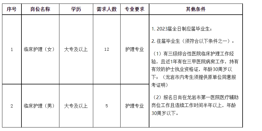 原文標(biāo)題:龍巖市第一醫(yī)院2023年度護(hù)理崗位招聘公告