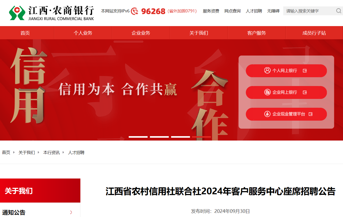 2024年江西省農村信用社聯(lián)合社客戶服務中心座席招聘公告已發(fā)布,報名時間:2024年9月30日至2024年10月21日17:00?,F(xiàn)將招聘公告原文發(fā)布如下: