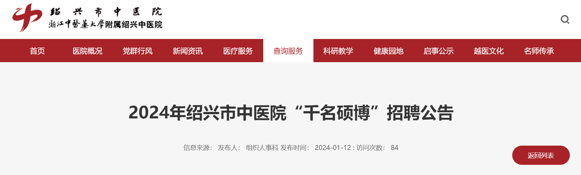 2024年浙江紹興市中醫(yī)院“千名碩博”招聘41人,報(bào)名時(shí)間2024年1月11日-19日?,F(xiàn)將招聘公告原文發(fā)布如下: