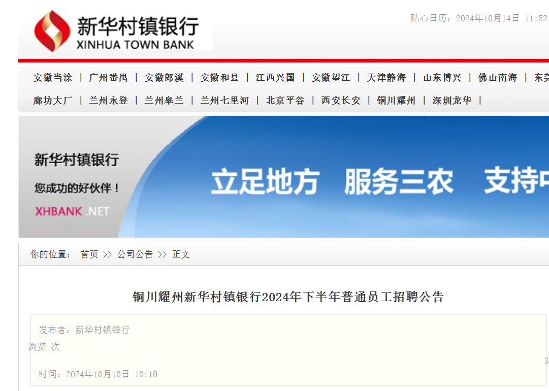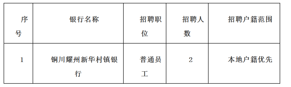 2024年下半年陜西銅川耀州新華村鎮(zhèn)銀行普通員工招聘公告已發(fā)布,報(bào)名及接收材料截止時(shí)間:2024年10月10日-2024年10月25日。現(xiàn)將招聘公告原文發(fā)布如下: