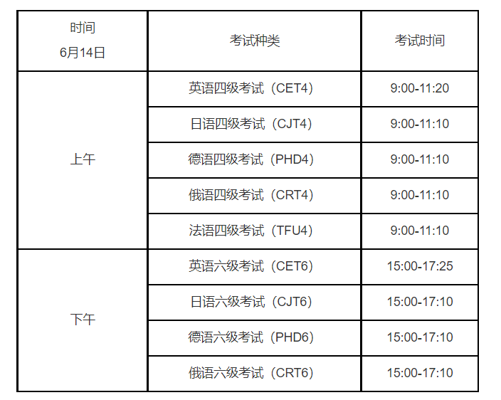 6月14日上午開考英語四級筆試(CET4),下午開考英語六級筆試(CET6),具體時間以準(zhǔn)考證為準(zhǔn)。