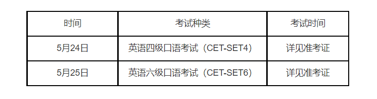 5月24日開考英語四級口語(CET-SET4),5月25日開考英語六級口語(CET-SET6),具體時間以準(zhǔn)考證為準(zhǔn)。