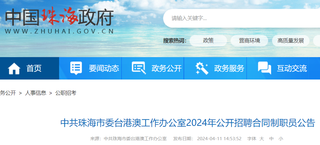 筆試成績(jī)、參加面試人選名單及面試相關(guān)事項(xiàng),將于2024年4月28日18時(shí)前在珠海市人民政府網(wǎng)站(https://www.zhuhai.gov.cn/)公布。