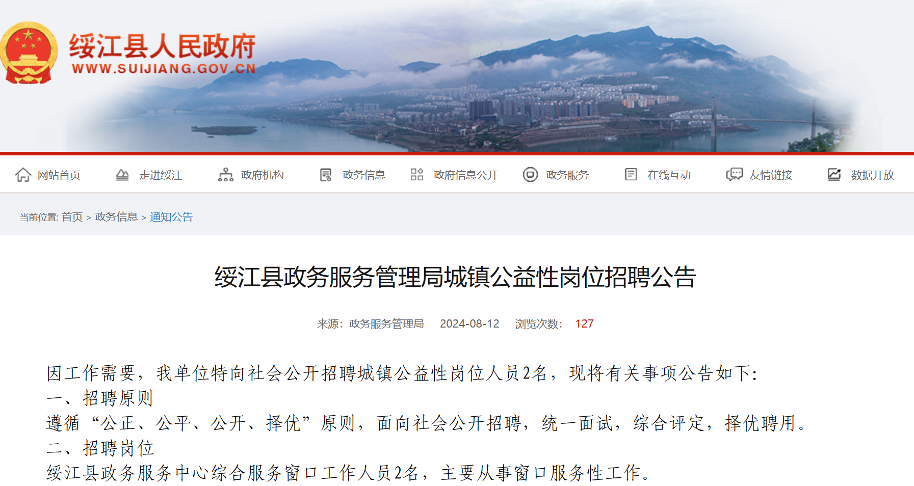 從綏江縣人民政府獲悉,2024云南昭通綏江縣政務服務管理局城鎮(zhèn)公益性崗位招聘公告已發(fā)布,報名時間為即日起至2024年8月27日止。