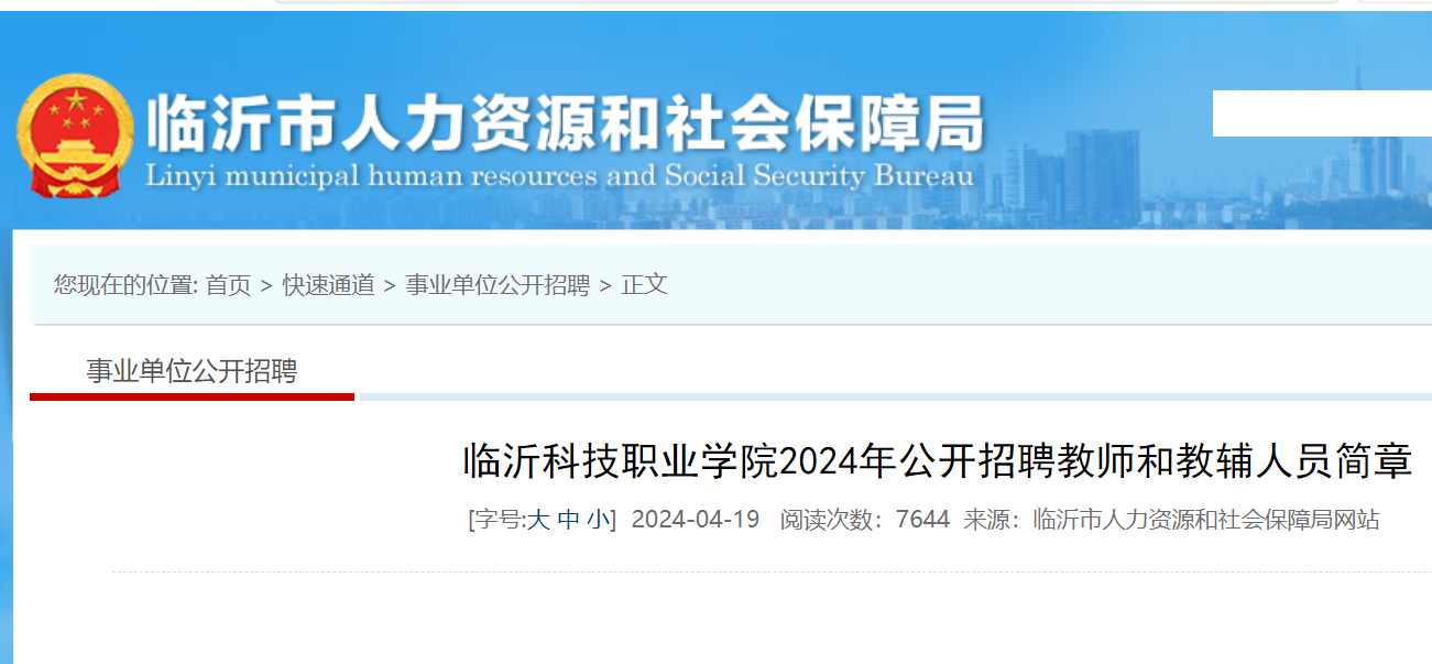 臨沂科技職業(yè)學(xué)院是經(jīng)山東省人民政府批準(zhǔn)、教育部備案的專科層次全日制公辦普通高等學(xué)校,學(xué)院位于臨沂市沂河新區(qū)。根據(jù)事業(yè)單位公開招聘工作有關(guān)規(guī)定,經(jīng)研究確定,2024年臨沂科技職業(yè)學(xué)院公開招聘教師和教輔人員33名,現(xiàn)將有關(guān)事項(xiàng)公告如下:一、招聘的范圍和條件