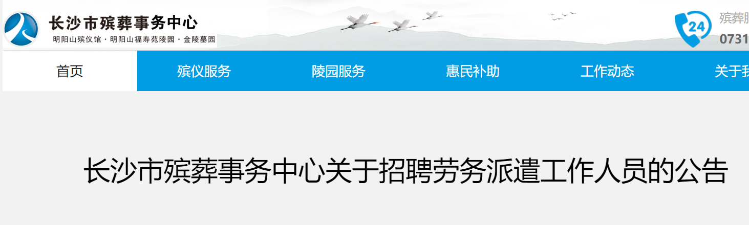 小編根據長沙市殯葬事務中心發(fā)布“長沙市殯葬事務中心關于招聘勞務派遣工作人員的公告”得知,2024湖南長沙市殯葬事務中心招聘勞務派遣工作人員15人,報名時間為8月26日至8月30日。