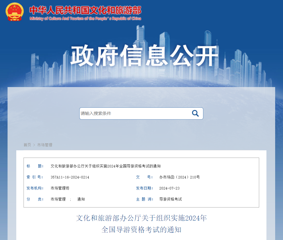 從中華人民共和國文化和旅游部發(fā)布的《2024年全國導(dǎo)游資格考試的通知》得知,2024年四川導(dǎo)游資格考試報名時間、條件及入口已公布,7月31日9:00至9月6日17:00進行報名,具體詳情如下: